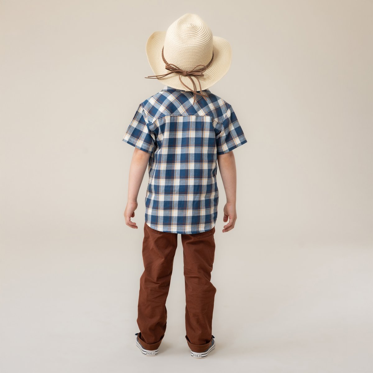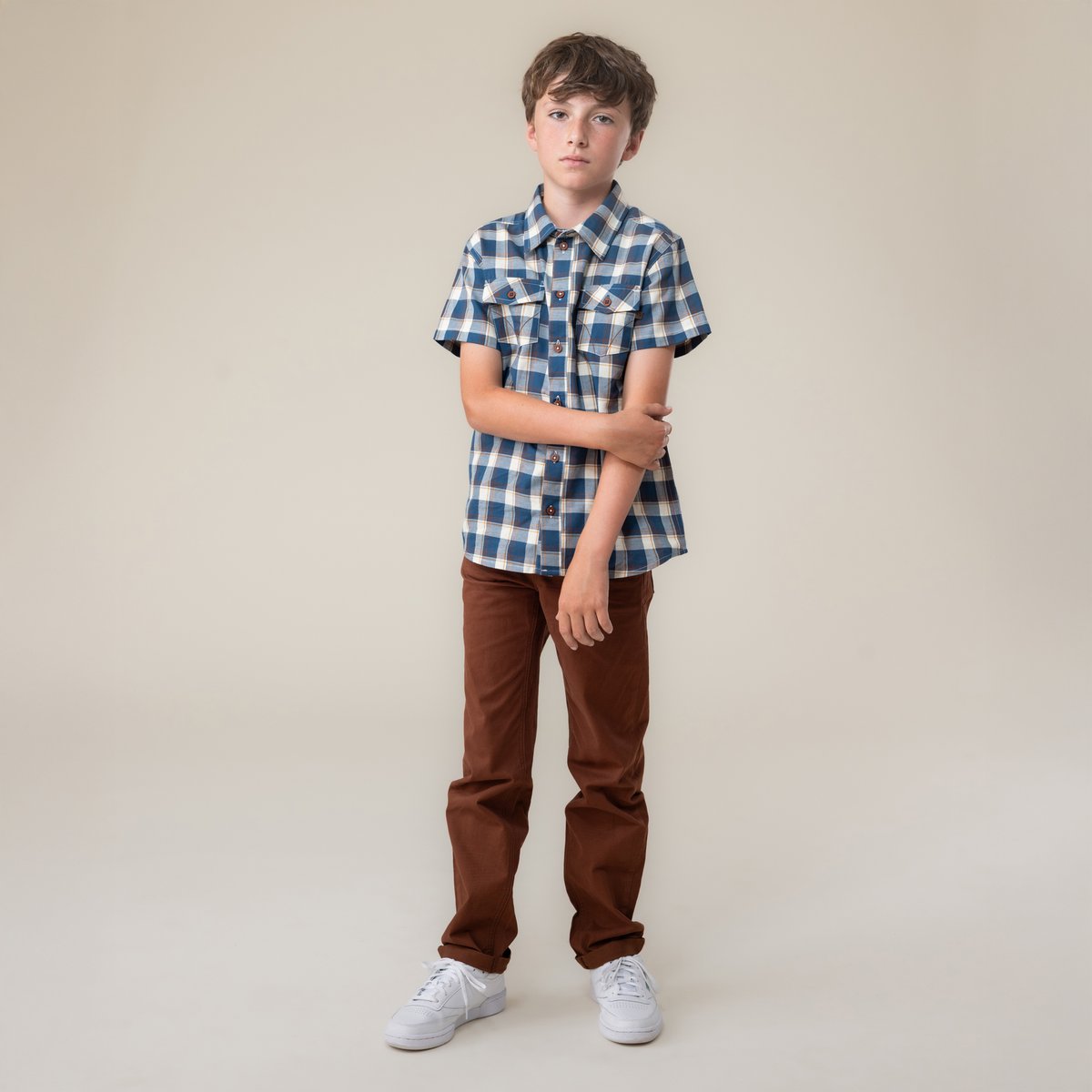 • Chemise en popeline à carreaux • Col chemisier • Manches courtes • Fermeture à boutons au-devant • Poches appliquées au buste