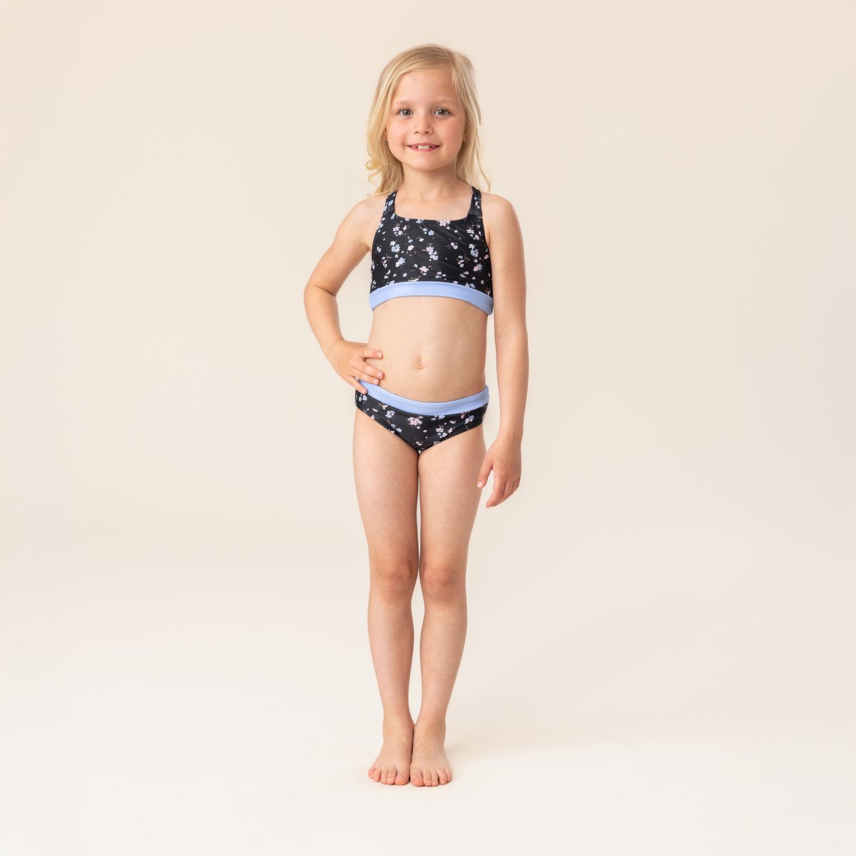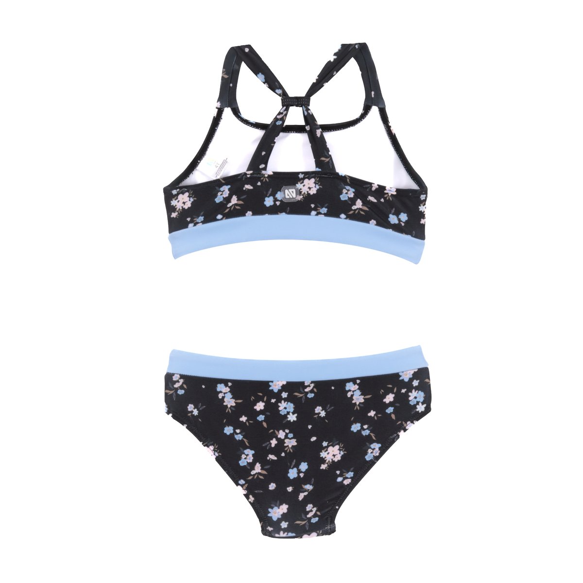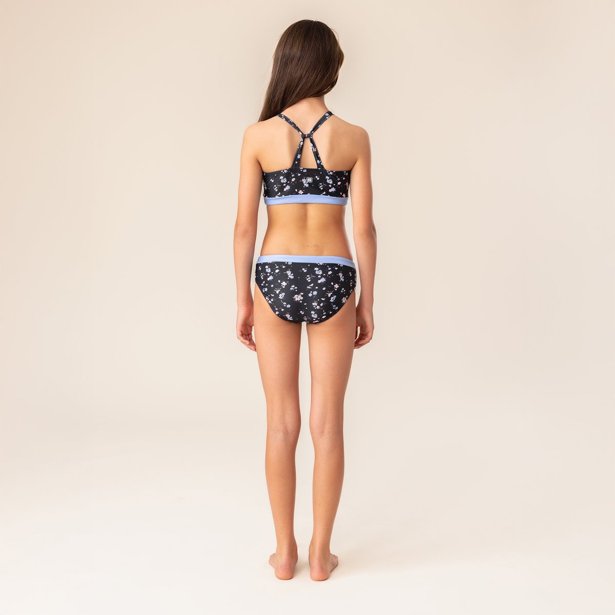 • Haut et culotte imprimés • Bretelles larges et ajustables • Empiècements unis • Écusson en caoutchouc • Protection solaire UPF 50+