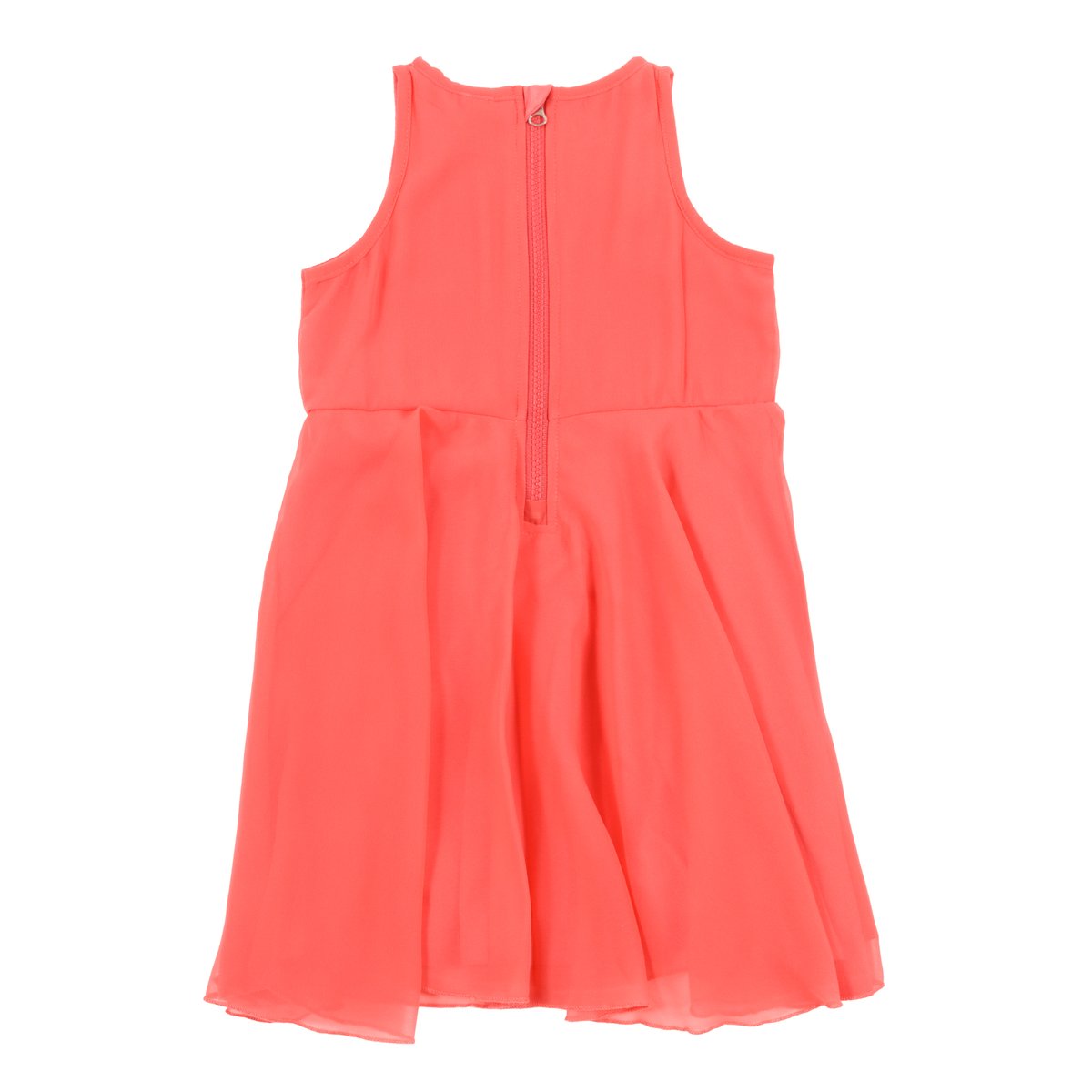 • Robe en PDR uni • Encolure ronde • Sans manches • Couture à la taille • Fleur décorative à la taille • Jupe froncée multicouches en voile et en PDR uni • Fermeture éclair au dos